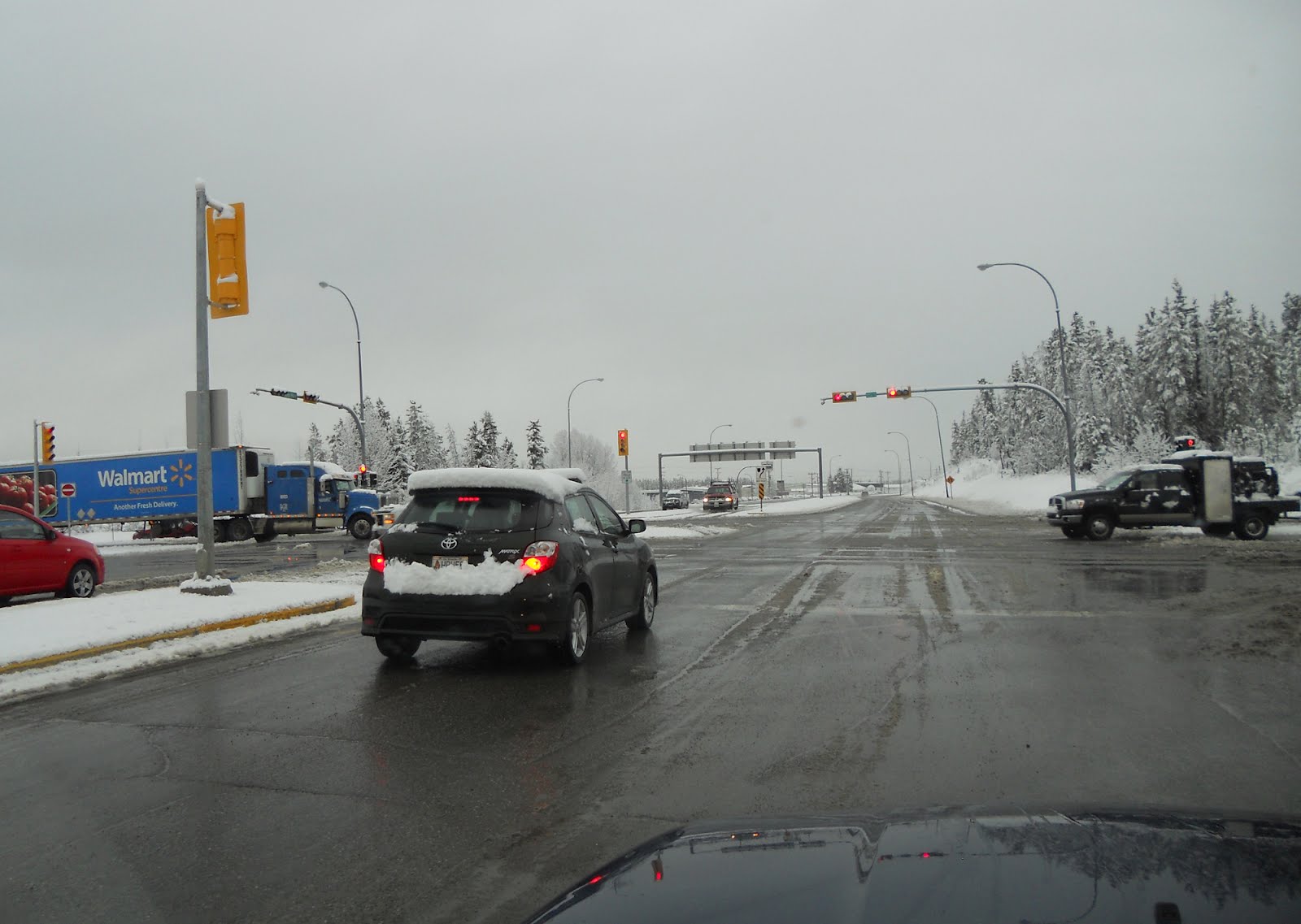 Gestern früh auf dem Weg in die Stadt. Whitehorse versinkt im Schnee. Hier am Alaska Highway, links geht es den Two Mile Hill hinunter in die Stadt. Die Räumfahrzeuge sind unterwegs. Es ist matschig auf der Fahrbahn. Nicht nur die ersten Touristen haben sich gewundert.